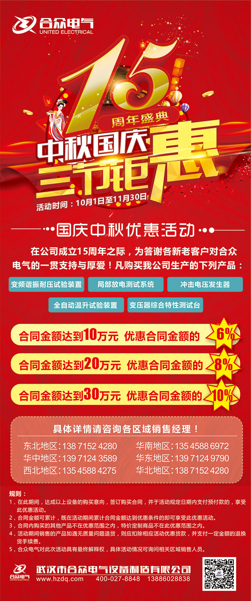 中秋國慶佳節(jié)即將來臨,在這個美好而又祥和的時候,也正值我司成立十五周年的誕辰,在這個三節(jié)同慶的日子里,我司為了回饋各位新老客戶多年來對我司的信任和支持,現(xiàn)正式啟動“合眾十五載,感恩一路有你”為主題的國慶中秋優(yōu)惠活動,凡在10月1日至11月30日期間購買我司設(shè)備,合同金額達到一定金額將享受到巨額優(yōu)惠,詳細活動細節(jié)請看上圖,在近期有采購意向的朋友,請抓住這次千載難逢的大好機會,趕緊拿起手機行動起來吧!